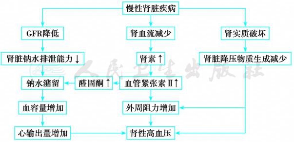 肾实质病变时,由于肾小球滤过率下降,致水、钠滤过减少;肾小管功能损害,水、钠转运失常;再由于肾缺血、肾实质损伤等因素导致肾素增多、舒血管物质减少、交感神经兴奋,使肾小管重吸收水、钠增加,引起体内水钠潴留,从而使血容量和细胞外液增加,心搏出量增多,故产生高血压。