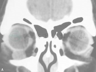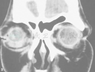 A、B.冠状CT可见右眼球下方囊性密度影,边界清楚。
