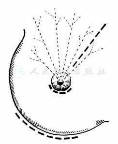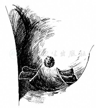 脓肿形成后,主要治疗措施是及时作脓肿切开引流。手术时要有良好的麻醉,为避免损伤乳管而形成乳瘘,应作放射状切开,乳晕下脓肿应沿乳晕边缘作弧形切口(图2)。深部脓肿或乳房后脓肿可沿乳房下缘作弧形切口,经乳房后间隙引流。切开后以手指轻轻分离脓肿的分隔,以利引流。脓腔较大时,可在脓腔的最低部位另加切口作对口引流(图3)。