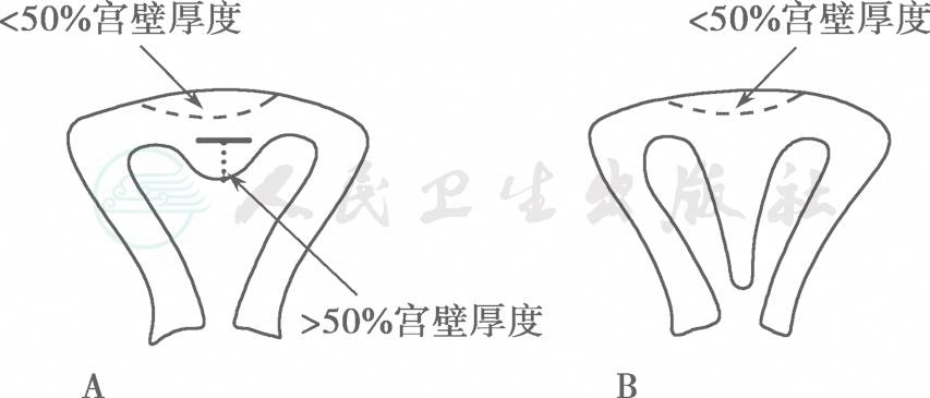 纵隔子宫(septate uterus)属U2类,为一类子宫外形正常或子宫底中线内陷<50%宫壁的厚度,但子宫底中线内部呈隔样内陷、内陷厚度>50%宫壁的厚度,为双侧副中肾管融合正常,但双侧间隔组织吸收异常所致。根据纵隔分隔宫腔程度,可分两类:①不全纵隔子宫(分隔宫颈内口之上的宫腔);②完全纵隔子宫(分隔宫颈内口之下的宫腔),可有宫颈,即双宫颈纵隔子宫或无宫颈,或阴道异常(图1)。