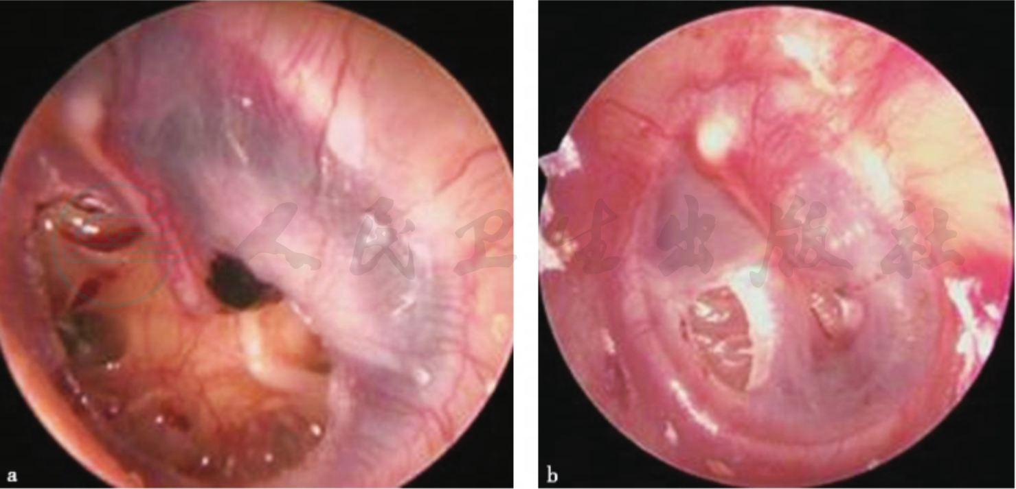 大部分外伤性鼓膜穿孔的部位位于鼓膜紧张部,由于紧张部鼓膜固有层的纤维大部分呈放射状排列,而仅在靠近鼓环边缘处才有较多环状纤维,因此我们临床上见到外伤性穿孔形态最多的为梭形、裂隙状(图1A)。但不同程度的外伤可导致不同程度的损伤,因此亦可呈现圆形(图1B,图1C)、椭圆形(图2A)、不规则形等不同大小的大穿孔,甚至可出现多处穿孔(图2B)。既往文献根据穿孔面积大小可分为小穿孔(穿孔面积<1/2象限,或<7mm2)、中穿孔(穿孔面积为1/2~2象限,或7~20mm2)、大穿孔(穿孔面积>2象限,或> 20mm2)。不同大小面积的穿孔其愈合率也不同。Jelling通过对133例137耳外伤性鼓膜穿孔进行临床观察发现,约97%可自行愈合,平均愈合时间为3~4周,且穿孔大小是影响愈合时间的重要因素。另有研究报道,患者年龄大、并发感染、鼓膜上皮内翻等均影响穿孔愈合。