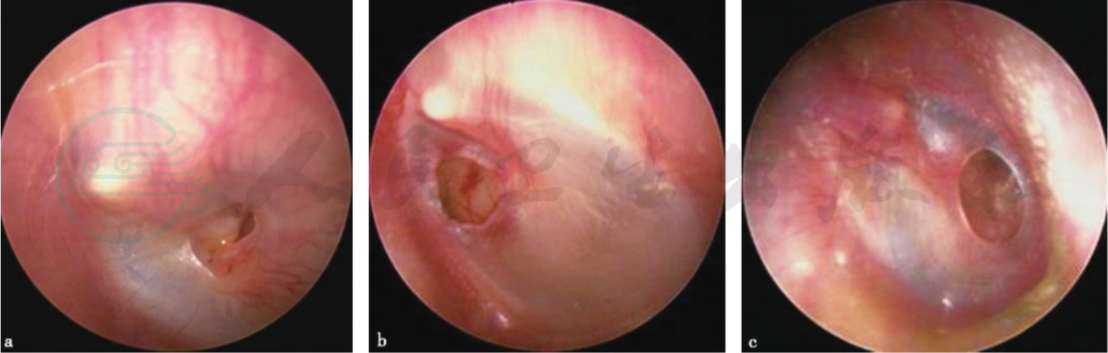 注:a.梭形小穿孔,<1/2象限;b.圆形小穿孔,上皮外翻,<1/2象限;c.圆形中穿孔,1/2~2象限。