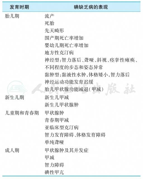 1983年,Hetzel提出了碘缺乏病这一概念,取代了过去传统的说法——地方性甲状腺肿与地方性克汀病。这一新概念是指缺碘对生长发育所造成的全部影响,它反映了缺碘对人类健康损害的全部表现,从轻至重以及临床损伤。缺碘对个体的损伤取决于缺碘的程度、持续时间、机体所处的发育阶段以及机体对缺碘的反应水平。表5列出了碘缺乏病的全部内容,在不同的发育阶段,碘缺乏病的表现也不一样。