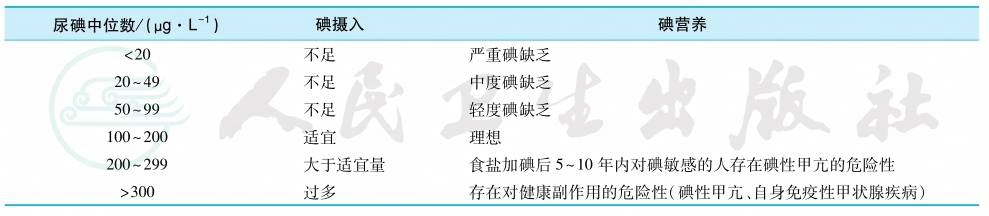 4)可接受的碘营养状态:尿碘在300μg/L以下(适宜水平为100~200μg/L)。