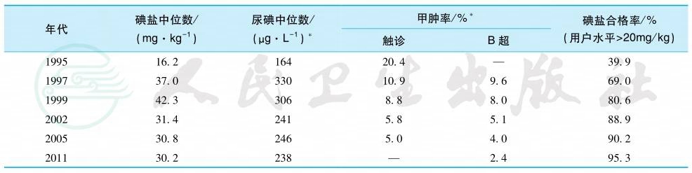 中国是受碘缺乏严重威胁的国家之一。据粗略统计,在20世纪70年代实施防治措施前,中国有地方性甲状腺肿患者3500万人,典型地方性克汀病患者25万人;20世纪90年代估计全国各省、市、自治区均存在程度不同的碘缺乏,约有7.2亿人生活于缺碘地区,IDD分布于1807个县,27 128个乡镇。更为严重的是还有为数更多的亚克汀病患者,据估计有数百万之多。病区学龄儿童的智商比正常人低10~11个百分点,而病区每年约出生600万人,若不加以控制,这将严重影响儿童的智力发育,进而将对我国人口素质和经济发展带来难以弥补的损失。1995年以前儿童甲状腺肿大率20%以上才定为IDD病区,而现在儿童甲肿率5%以上则定为病区,因此我国绝大多数地区都属缺碘地区或碘缺乏病地区。我国从1995年实施全民食盐加碘(USI)后,在消除IDD上取得了历史性的成就,表7-10-16显示了在改善人群碘营养水平和消除IDD上的巨大进展。