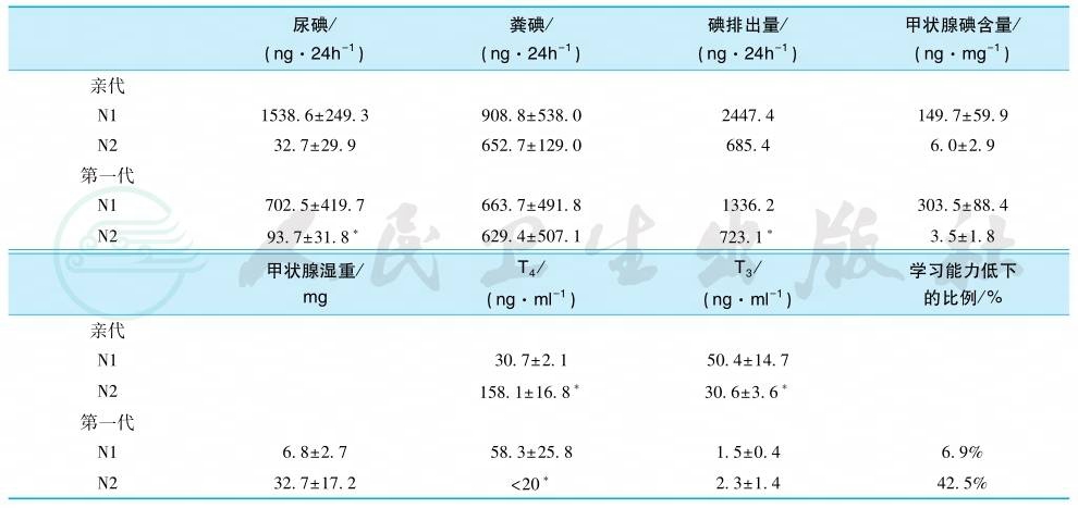 注:1.亲代为低碘饮食后6个月的结果,两组n=10;