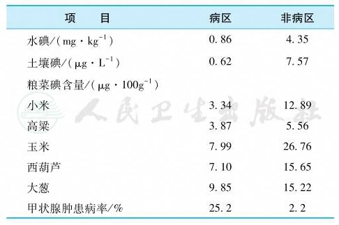 世界上任何碘缺乏病流行的地区,其外环境的含碘量都是低的。表1显示承德地区(病区)的水、土、粮菜的碘含量远远低于非病区,而甲状腺肿的患病率显著高于非病区。