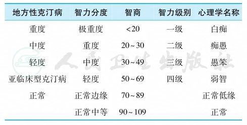 地方性克汀病就临床表现分为重、中、轻三度,极轻型的属亚克汀病。这种分类主要是依照精神发育迟滞的分度方法(表6)。
