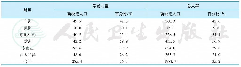 碘缺乏和碘缺乏病是全球性公共卫生问题。表7-10-15列举了2003年WHO统计的全球碘缺乏的状况,有54个国家的人群尿碘值中位数低于标准水平,19.9亿人面临碘缺乏的威胁,占总人口数的35.2%,其中2.9亿为学龄儿童,占学龄儿童总数目的36.5%。