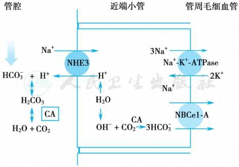 的重吸收是与H+的分泌相关联的。近端小管上皮细胞内的H2O解离成H+和OH-,通过管腔侧的Na+-H+交换子(NHE3),将 Na+转运入细胞内,H+排泌至管腔,转运的动力来自上皮细胞基侧膜上的Na+-K+-ATP酶。近端小管管腔膜上的H+-ATP酶也参与了小部分的泌H+作用。