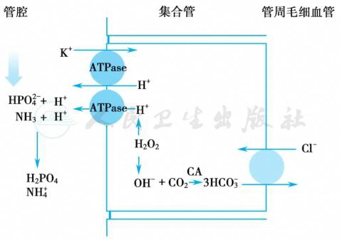 和H+。集合管细胞可分为主细胞、α型闰细胞和β型闰细胞。α型闰细胞为泌氢细胞,其泌氢依赖于管腔膜上的H+-ATP酶(H+泵)和H+-K+-ATP酶。由于管腔侧无碳酸酐酶存在,远端小管对