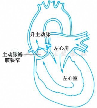 主动脉口狭窄使左心室排血受阻,左心室压力增高而主动脉压力降低。左心室逐渐肥厚和扩大,最后发生心力衰竭。瓣膜狭窄的患者,升主动脉可发生狭窄后扩张。