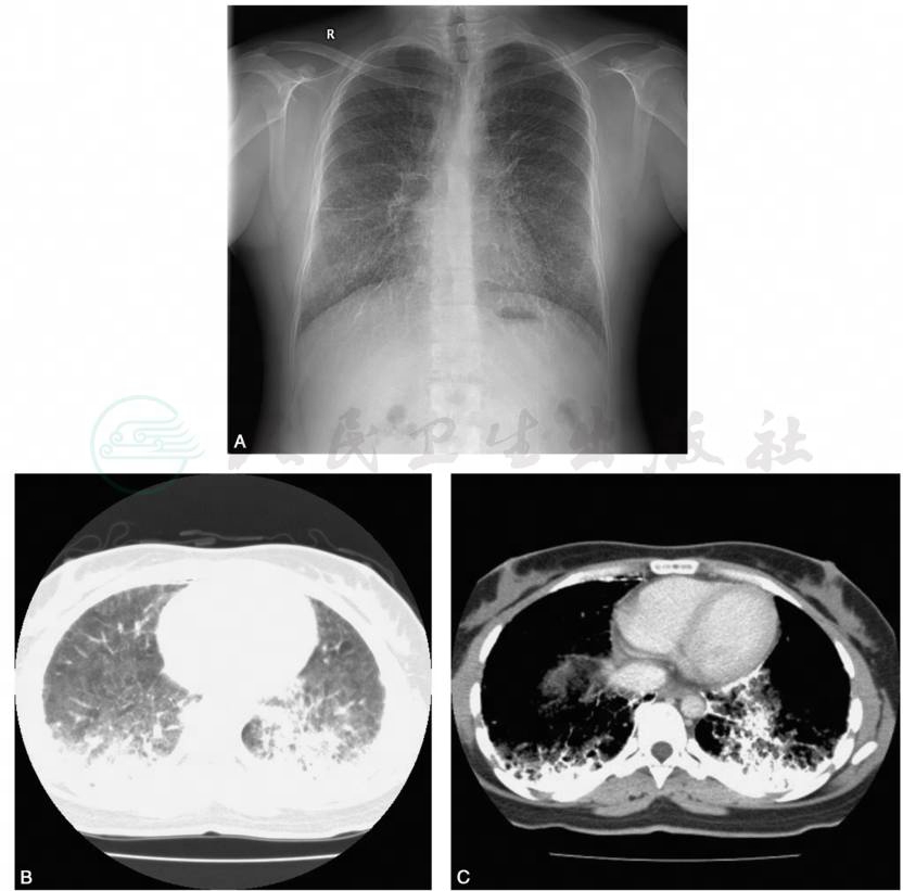 A.X线片:双肺弥漫性分布的细小沙砾状结节影,中下肺野为主;B.CT:双肺透亮度降低,呈磨砂玻璃样改变,弥漫性分布的微小结节,密度较高;C.纵隔窗显示肺野内不规则点状、条状致密影,胸膜下可融合成片形成“火焰征”和“白描征”。