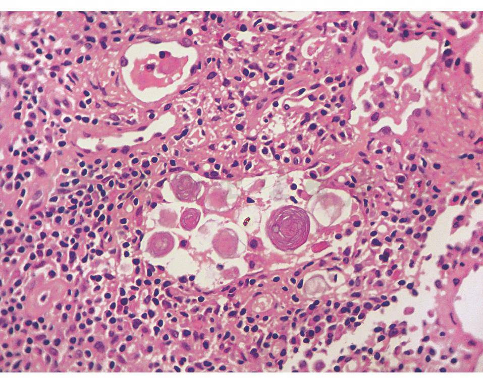 本病主要侵犯两肺,病肺变硬,重量明显增加,触之有沙砾感,切面呈“细纱纸”状纹理,主要分布于中下肺。镜下70%~80%的肺泡内有特征性的层状、年轮状、同心圆状微结石形成(似洋葱头皮),直径50~1000μm,微结石沿支气管、血管特别是叶间胸膜下分布偏多,几乎都位于肺泡腔内,但也可位于肺泡壁,向肺泡腔内凸入(图1)。微结石以钙、磷酸盐为主要成分,过碘酸希夫染色呈紫红色。肺泡灌洗液可见沙砾样物质沉积,沉渣包埋可见层状钙化小体。病变早期肺泡壁结构完整,进展期和末期伴有肺泡壁肥厚、间质纤维化等,可伴肺气肿和肺大疱。