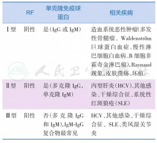 1. 冷球蛋白分类 冷球蛋白分为三型:①Ⅰ型冷球蛋白由单克隆免疫球蛋白组成,多数是IgM,少数为IgG或IgA;②Ⅱ型冷球蛋白由单克隆免疫球蛋白(IgM-κ)和多克隆免疫球蛋白(通常为IgG)所组成的免疫复合物;③Ⅲ型冷球蛋白为多克隆免疫球蛋白复合物或为多克隆免疫球蛋白同血清中非免疫球蛋白成分所组成的冷沉淀物(表1)。Ⅱ型和Ⅲ型冷球蛋白均有类风湿因子(RF)活性,多伴发自身免疫病(Ⅲ型)或淋巴网状系统增生性疾病(Ⅰ和Ⅱ型)。