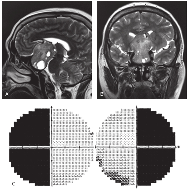 A,B.头颅MRI,显示鞍区占位;C.视野表现为双眼颞侧偏盲