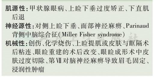 如果眼睑成型手术时皮肤切除过多,会导致机械性眼睑退缩。创伤也可能导致组织功能不全,在伤后组织重建或伤口延迟愈合时可见。此外。无意中将皮肤、眼轮匝肌或上睑提肌等组织与眶隔进行连接,也会导致机械性退缩;上睑经眶隔与眶上缘相连也可引起眼睑退缩。更常见的可导致瘢痕性睑退缩的原因包括撕脱伤、感染或眼睑皮肤炎症和烧伤等。不常见的原因是浸润性肿瘤、带状疱疹、化学损伤或眼睑重建术后改变。眉毛固定是另外一种导致瘢痕性睑退缩的医源性原因,通常见于麻痹性眉下垂和整形手术后。