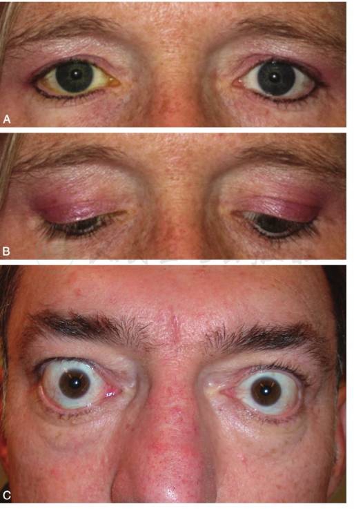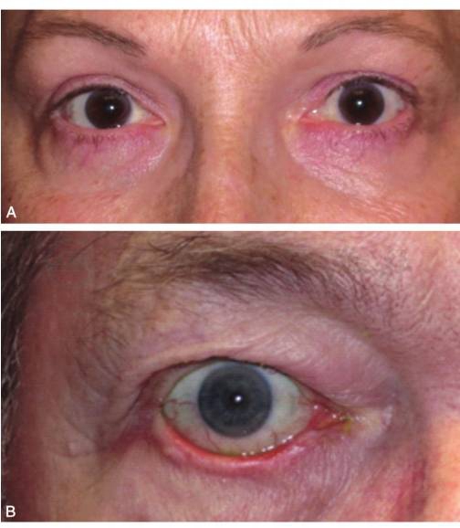 由于两种情况经常同时出现,所以眼睑退缩应该与眼球突出相鉴别。眼眶减压术可以减轻眼球突出的程度,但很少能减轻眼睑的退缩。更常见的是,由于提肌的纤维化,眼睑退缩持续存在。事实上,如果眼眶眶底被减压,眼球的下移可能会加重上睑的退缩。