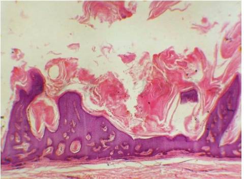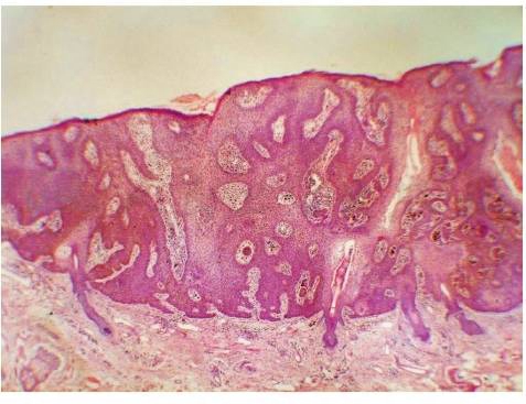 主要的病理组织变化是表皮过度角化,棘细胞层不规则地肥厚及乳头瘤性增生,但表皮下界整齐,和附近正常表皮的下界几乎在同一平面上。增生的表皮细胞除为正常的棘细胞外,还有类似基底细胞但较小的基底样细胞(basaloid cells)。