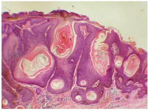 角化型:有明显的角化过度及乳头瘤样增生。增多的角质填塞在表皮扭曲的凹陷部分,有时在切片中呈角质囊肿状,被称为假角质囊肿。大部分表皮细胞是外观正常的棘细胞(鳞状细胞),少数是散在的小群基底样细胞(图1)。