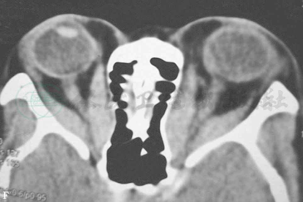TAO常有限制性眼外肌病变,又称甲状腺眼外肌病,眼外肌轻度受累者临床不易确定,CT或MRI检查可显示出眼外肌长大。垂直肌受累比水平肌更易受累。下直肌受累最常见,占60%(图1A、B、C),依次为内直肌50%,上直肌40%(图2D、E)和外直肌29%。但眼外肌病变通常为双侧,多条眼外肌增大并不少见。CT扫描(轴位及冠状位)显示肌腹呈纺锤状扩大,边界清楚,肌腱不增大。TAO临床可根据患者复视,眼球运动受限,眼球移位,眼眶CT扫描证明眼外肌增大者占93%。TAO眼眶CT扫描时不能只作水平扫描,否则容易将单眼的下直肌增大误认为眶内肿瘤,作冠状扫描后方可得出正确诊断。