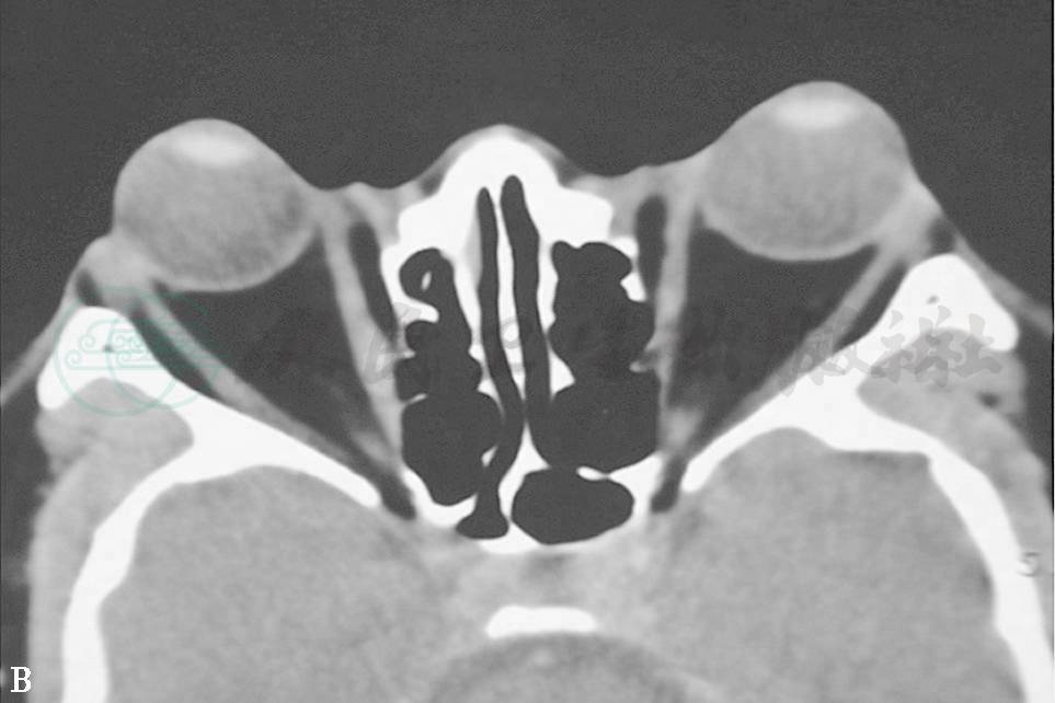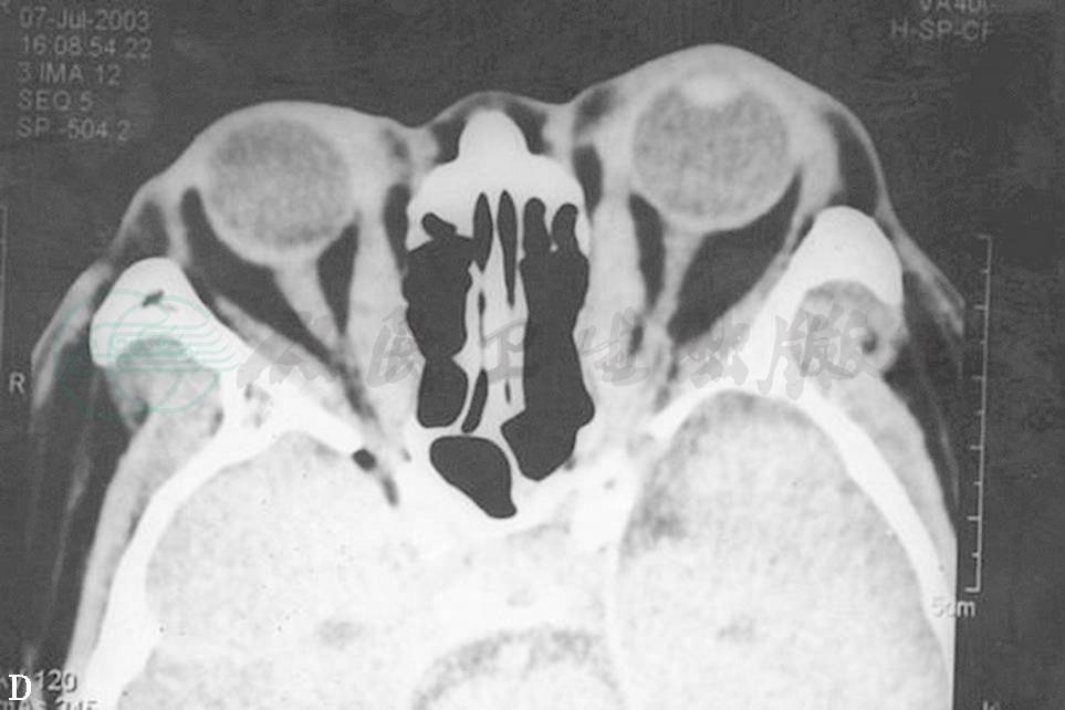 眼球不全脱位可发生在进行性TAO中,但比较少见,一般发生在急性病例,是由于眼眶内脂肪容积迅速增加,致使眼球向前移位,眼球的赤道部达眶缘部。眼睑位在眼球前表面,有限制眼球向前突出的作用,当眼睑向后退收缩时,严重时眼睑睑缘位于眼球赤道后,加重眼球突出。CT扫描均显示眶内脂肪含量增加,而眼外肌无明显扩大(图4)。