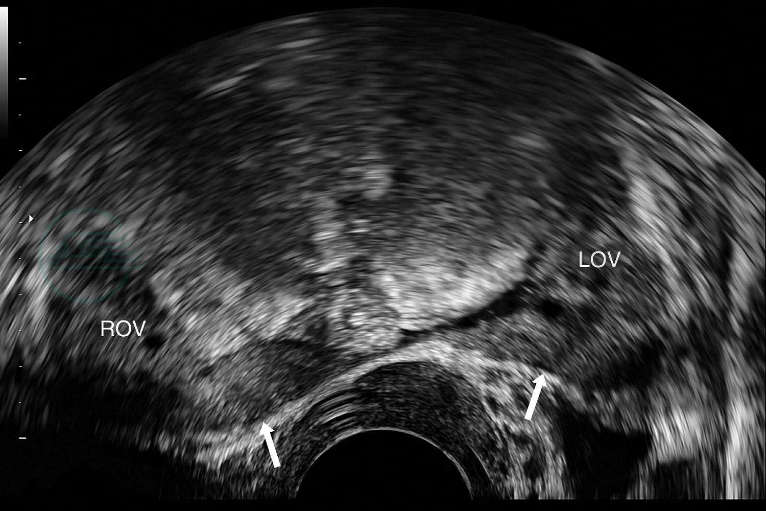 图示盆腔内双侧卵巢(ROV、LOV)旁两个子宫样肌性回声结构(箭)