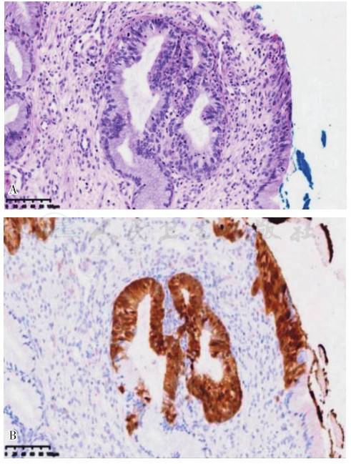 A.宫颈部分黏膜腺体被具有恶性细胞学表现的上皮所替代;B.免疫组化染色显示:宫颈黏膜腺体中的异型细胞呈现p16弥漫强阳性。