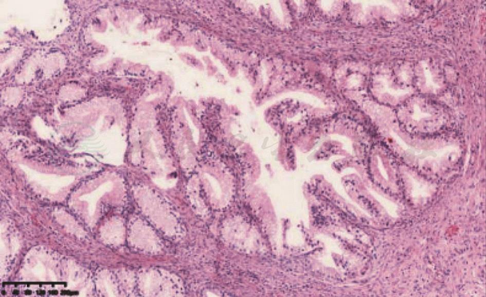 可见宫颈腺体呈现小叶状增生,腺泡排列密集,腺腔大小不等,部分腺腔内可见乳头结构,细胞胞浆透亮,呈现胃幽门腺化生,部分细胞核增大,移向腺腔面。