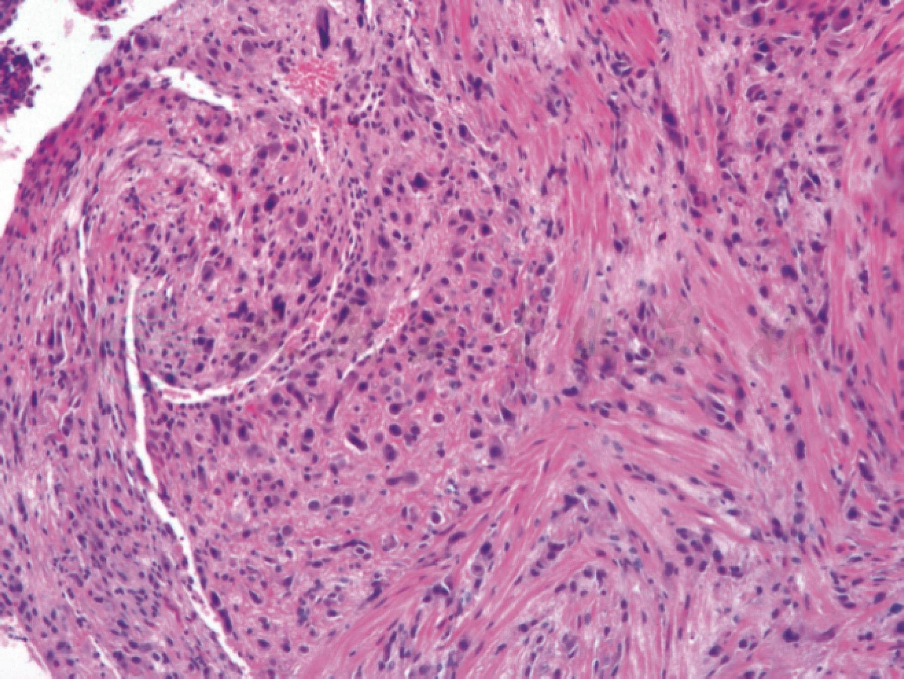 显微镜下:子宫内膜及浅肌层的中间型滋养细胞数量增加,中间滋养细胞呈单个、小巢状、小片状排列,可进入子宫内膜腺体及平滑肌纤维,但不破坏肌纤维。周围常伴有胎盘绒毛(图1)。