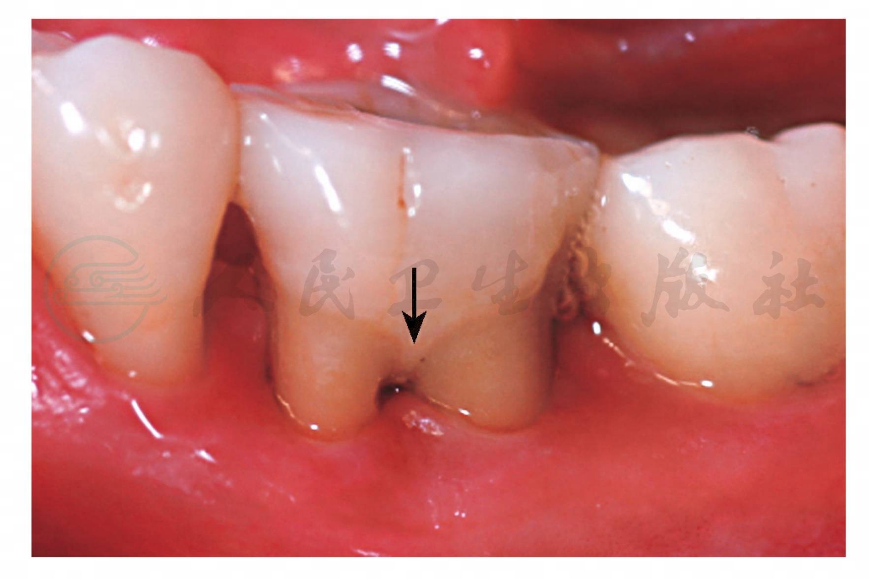牙釉质在釉牙骨质界的根方异位沉积呈指状突起伸向根分叉处,有的突起还能进入根分叉区内,被称为“颈部釉突(cervical enamel projection)”(图1),是根分叉病变的发病因素。有学者采用探诊、拍根尖X线片、翻瓣等方法观察了78名有根分叉病变的患者,发现有釉突的牙容易发生根分叉区的牙周病变,患病率可达82.5%,因为该处结合上皮的附着易被破坏,而无颈部釉突的磨牙根分叉病变只有17.5%。