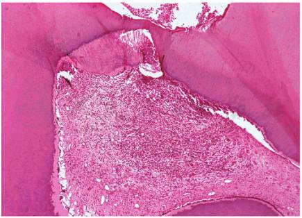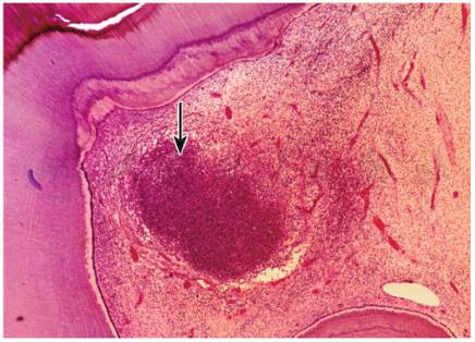牙髓血管扩张,髓角部密集的炎细胞浸润