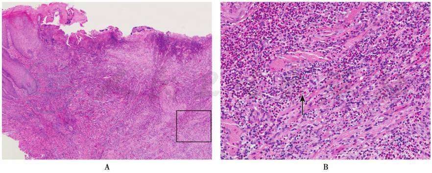 A.表面溃疡,炎症浸润深达肌层 B.图A的局部(方框区)放大,肌束间见大量嗜酸性粒细胞浸润(箭头示)