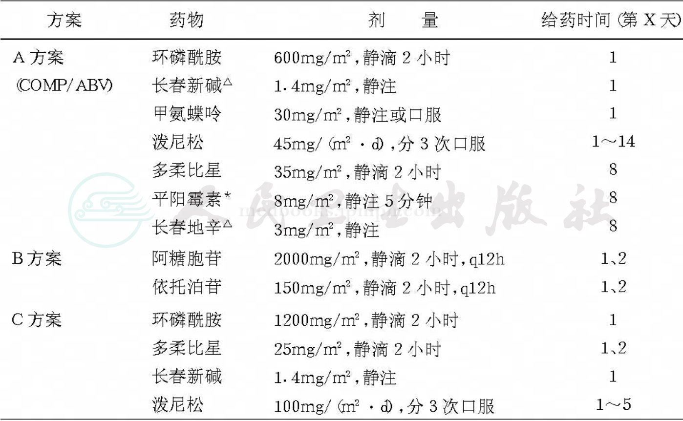 注:△长春新碱不超过2mg长春地辛不超过4mg。*或博来霉素首次剂量分2次用先2mg观察有无过敏反应余量4~6小时后应用。每个疗程21~28天