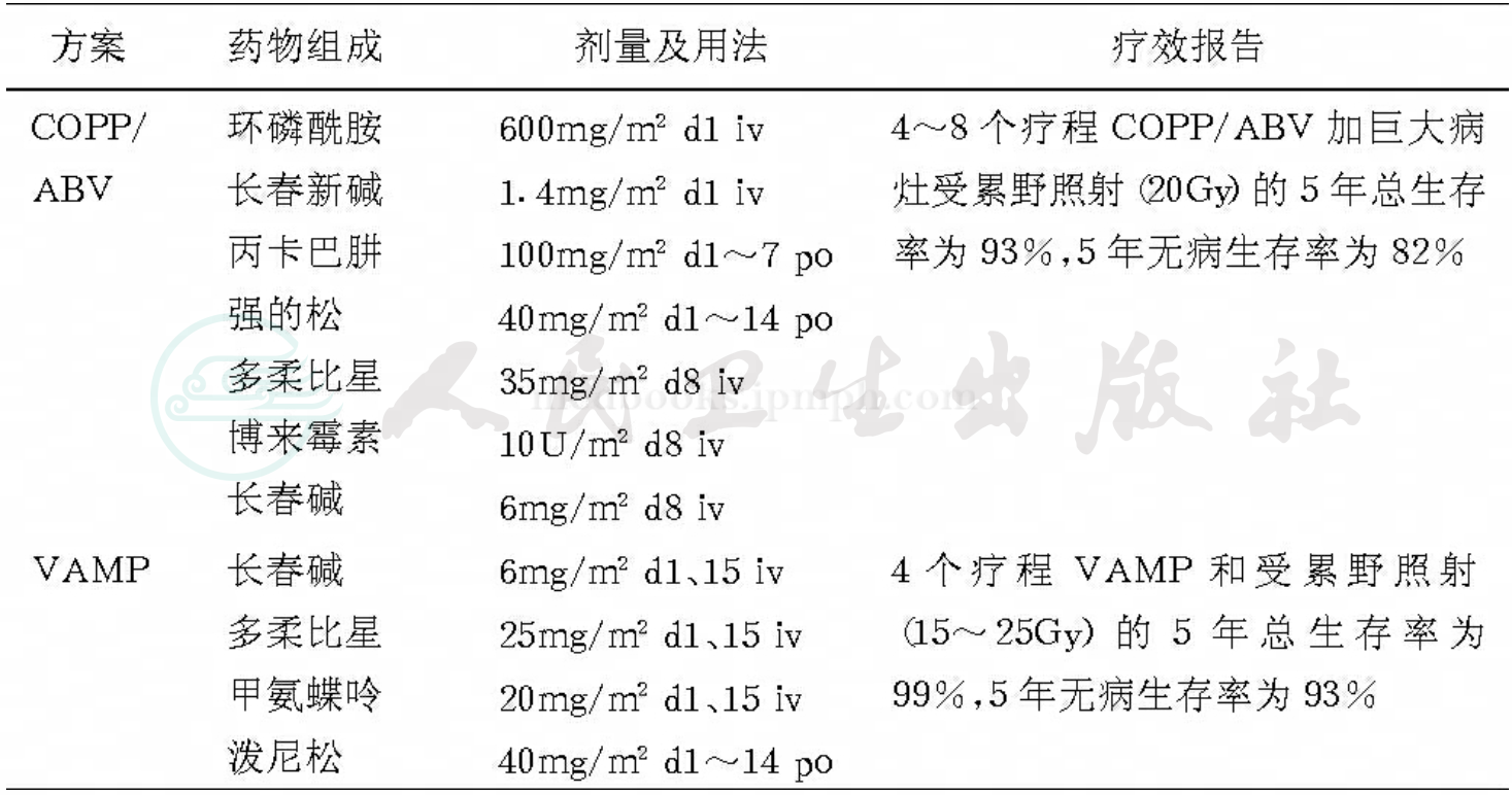 (2)国际常用方案:国际上HD化疗方案相对一致应用COPP、MOPP、ABVD最为多见其中以ABVD最为经典。逐渐倾向于肿瘤相关野低剂量(15~25Gy)放疗对已经完全生长发育的青少年单个巨大肿瘤可采用较高剂量放疗。也有一些治疗方案对可否取消放疗进行了临床研究结果提示无放疗的无病生存率与放疗组相似或略低。表4为国际上常用的HD治疗方案及疗效R。