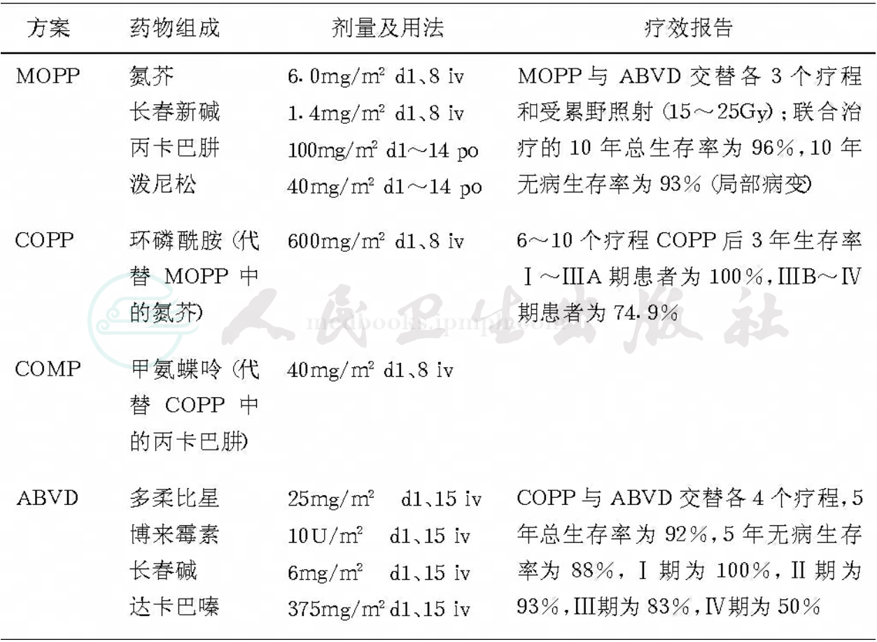 ABVD至今仍为标准的治疗方案目前仍无确切的资料证明有其他方案确实优于ABVD。根据不同分期(或临床分组)治疗时间以4~9个疗程为宜过长的维持治疗并不改善预后。MOPP对成人与儿童的晚期HD有50%的治愈率。ABVD方案仍可使50%的MOPP耐药者获得缓解。治疗过程中特别是难治或复发者应注意蒽环类药物累积剂量在儿童中一般不超过320mg/m2以免导致对心脏的远期毒性作用出现慢性难治性心功能不全。