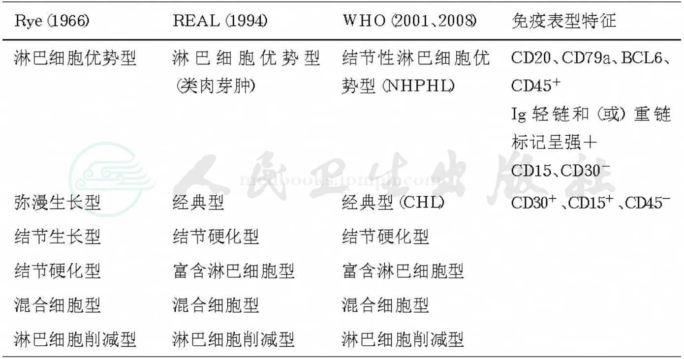 1966年提出RYE分类系统将HD分为4个组织学亚型。1994年Real及2001年、2008年WHO又分别在此基础上进行了修订三个分型间的关系及免疫标记特征见表1。目前国内外均采用WHO 2008年分型标准。