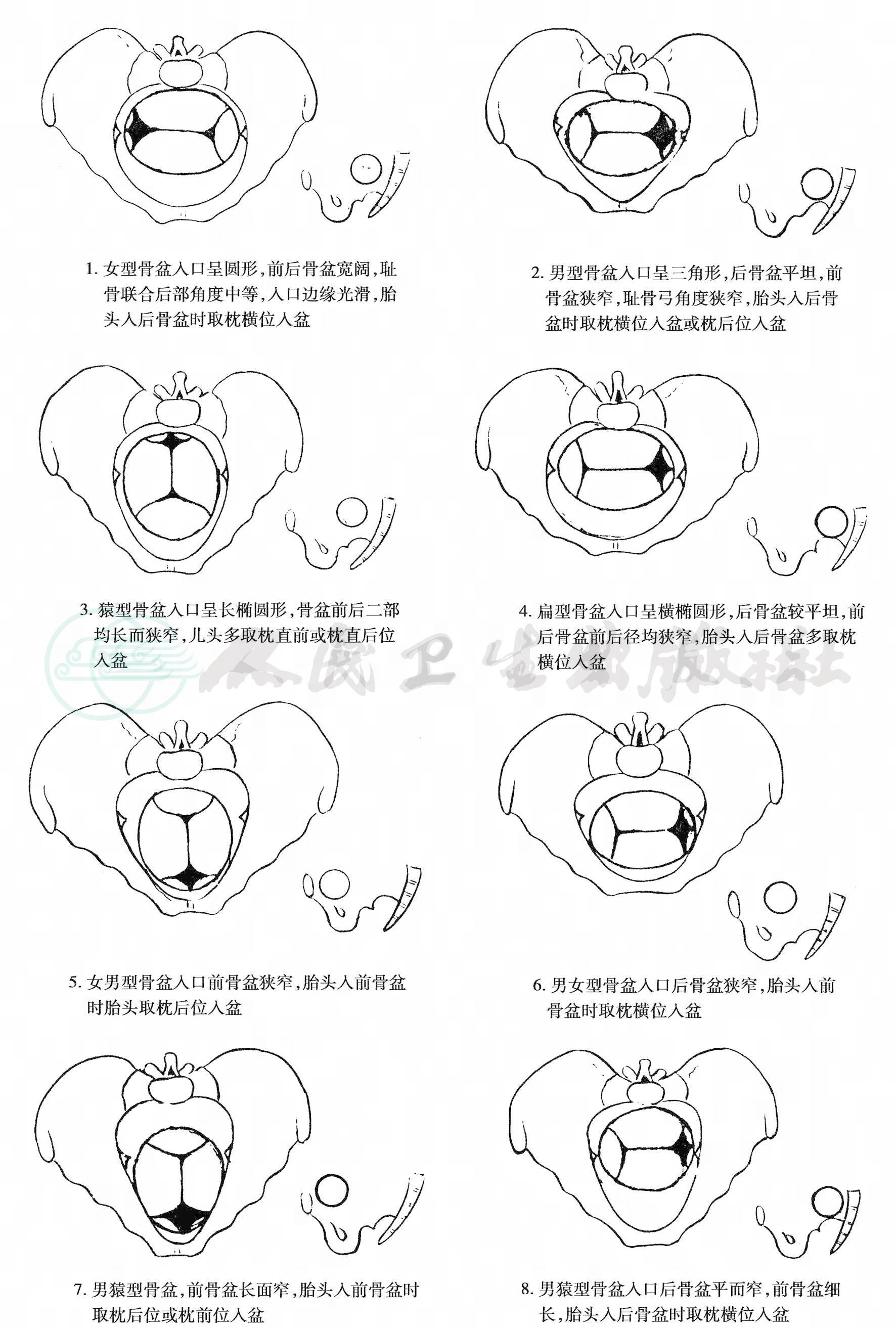 1)女型骨盆:骨盆入口呈圆形或椭圆形,骨盆入口横径远离骶岬,近于中央,横径大于或稍大于前后径,入口分为前、后两部,该两部均较宽阔,骶骨横凹有适当弧度,耻骨联合后方角度中等大,骨盆入口边缘光滑,适当曲度,骶椎5节,骶骨上段直立,下段前倾,坐骨切迹顶部近乎平坦、较宽。耻骨弓角度近90°,呈Norman式,耻骨坐骨支纤细有一轻度弯曲,骨盆两侧壁直立,出口宽,骨盆前部中等高度。
