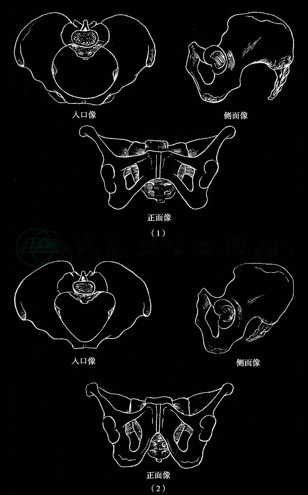 骨盆入口形态与胎头入盆所取的位置及入盆后的旋转有直接关系,女型骨盆入口前、后两部宽阔,适合胎头取枕横位入盆,入口以下部分宽裕,有利于胎头的旋转及娩出。猿型骨盆横径狭窄,前后径较长,有利于胎头取枕前位或枕后位入盆。如骶骨弯度或骨盆侧壁不利于胎头向前方选择时,易形成枕横位梗阻或枕后位梗阻。男型骨盆入口呈楔形或心脏形,除胎头易取枕横位入盆外,枕后位入盆者亦明显增多。男型骨盆结构极不利于胎头的下降和旋转,以致在分娩过程中常形成高位枕横位梗阻或枕后位梗阻,因而除骨盆径线较长或胎头相应较小外,一般极易形成难产。男、女型骨盆的各结构的不同差异(图40)。
