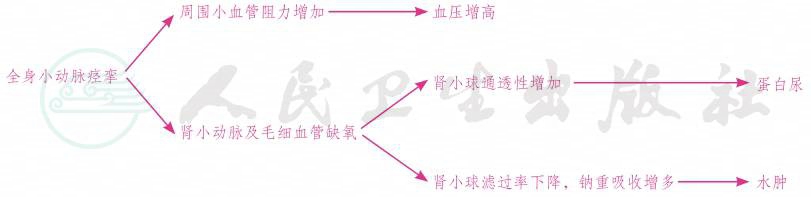 本病的基本病理生理变化是全身小动脉痉挛。由于小动脉痉挛,造成管腔狭窄,周围阻力增大,内皮细胞损伤,通透性增加,体液和蛋白质渗漏,表现为血压上升、蛋白尿、水肿和血液浓缩等。全身各组织器官因缺血、缺氧而受到不同程度损害,严重时脑、心、肝、肾及胎盘等的病理生理变化可导致抽搐、昏迷、脑水肿、脑出血、心肾衰竭、肺水肿、肝细胞坏死及被膜下出血,胎盘绒毛退行性变、出血和梗死,胎盘早期剥离以及凝血功能障碍而导致DIC等。主要病理生理变化简示如下:
