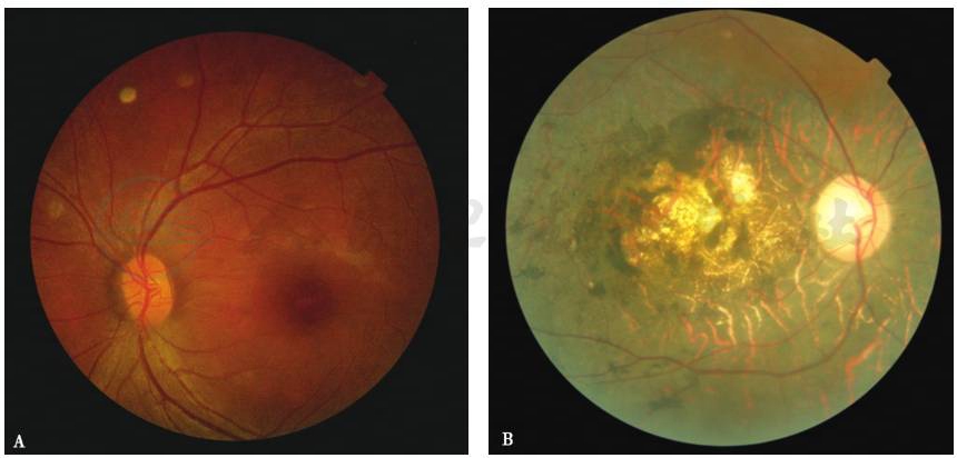 以遗传性视网膜疾病为例,不同疾病临床表现差别明显。①视网膜受累细胞先后及轻重不同:视网膜色素变性(retinitis pigmentosa,RP)(OMIM#268000),视杆细胞首先受损且重,逐渐累及视锥细胞;而锥细胞或锥杆细胞营养不良(cone/cone rod dystrophy,COD/CORD)(OMIM #120970)则以视锥细胞首先受损,视杆细胞受累较晚。②受累部位不同:卵黄样黄斑营养不良(vitelliform macular dystrophy,VMD)(OMIM #153700)和Stargardt病(OMIM #248200)主要累及黄斑,而RP首先累及中周部视网膜。③起病时间差异大:Leber先天性黑矇(Leber congenital amaurosis,LCA)(OMIM #204000)出生后即表现出明显视力低下,而多数RP在成年后中心视力才受损。④疾病进程不同:先天性静止性夜盲(congenital stationary night blindness,CSNB)与全色盲(achromatopsia)病情稳定,而大多RP、CORD及黄斑变性病情则进行性发展。还有一些其他遗传性视网膜疾病以综合征的形式表现,如Usher综合征表现为RP合并感音神经性耳聋;Alström综合征表现为CORD合并感音神经性耳聋、肥胖、胰岛素抵抗和肝肾功能异常,Bardet-Biedl综合征表现为RP合并肥胖、多指(趾)畸形、性腺发育不良和肾功能异常,通常都会严重影响患者视力。