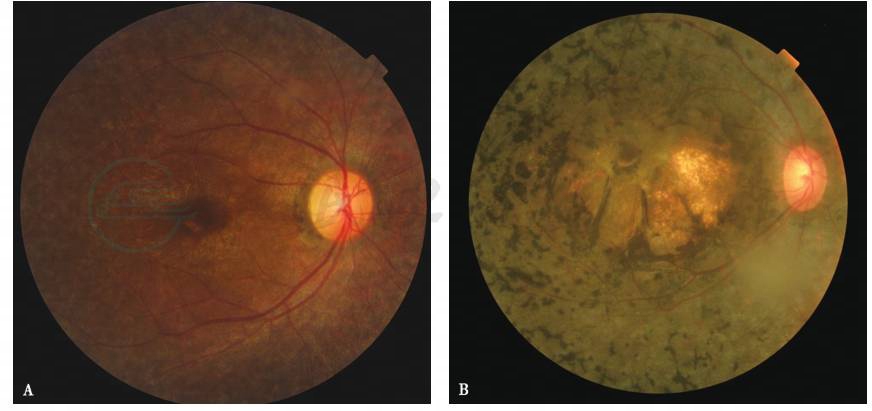 A.RPE65突变所致LCA;B.RDH12突变所致LCA