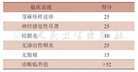 本病诊断主要依据典型临床表现,对所有出现周期性发热、荨麻疹、不能解释的全身炎症反应和阳性家族史,特别是很早期发病的患儿均应怀疑本病的可能。国际儿童风湿病试验组织(Pediatric Rheumatology International Trials Organisation,PRINTO)和国际AID注册项目(Eurofever Project)分析总结了1 880例注册AID患者后提出了基于循证医学的临床分类标准(表1)。许多CINCA病例为新发突变,故可无明确家族史。