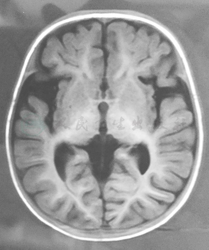 NAAS患儿实验室检查表现为全身炎症指标异常,包括红细胞沉降率(erythrocyte sedimentation rate,ESR)、C反应蛋白(C-reactive protein,CRP)和血清淀粉样蛋白A(serum amyloid a,SAA)升高,急性发作时血白细胞升高,脑膜炎时可有颅内压升高和脑脊液细胞数增多,常出现贫血和血小板增多。超声检查可见淋巴结和肝脾轻度肿大;膝部X线检查可见髌骨肥大/过度生长、骨骺过度生长和关节炎的表现。头颅影像学检查可见脑室扩大、脑萎缩等表现(图2)。