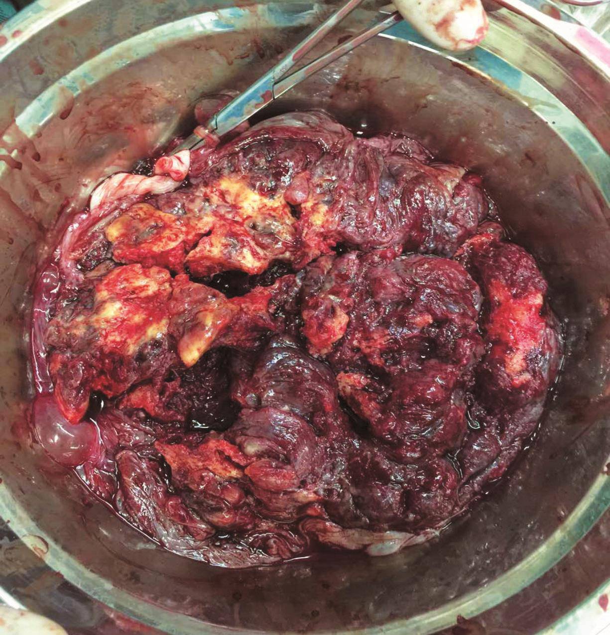 母体血流流经螺旋动脉受阻于血栓或胎盘后血肿时可出现 胎盘梗死(placental infarction)(图1)。大部分胎盘梗死位于胎盘的中央部,少部分也可发生于胎盘底部。病灶呈圆形或卵圆形,单个或多个,大小不等,形成时间不一,如为苍白或灰色质硬区域多为陈旧性梗死,如为黑色区域多为新鲜梗死。小的胎盘梗死,最大直径多<3cm,在25%的正常胎盘中可见,考虑是母体子宫胎盘循环闭塞所致,提示一种正常的胎盘老化。复杂而大的梗死,特别是梗死位于胎盘中心部位和发生在孕早、中期,临床症状显著,可能引起,低出生体重、胎儿死亡和新生儿窒息。大的胎盘梗死可能与母体血栓形成呈正相关,目前认为系统性红斑狼疮、高龄产妇等是胎盘梗死高危因素。