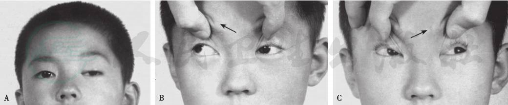双上转肌麻痹(double elevator palsy)是指同一只眼的两条上转肌(上直肌和下斜肌)同时麻痹,表现为该眼内上转、外上转均受限,原在位呈下斜视。当健眼注视时麻痹眼向下移位,上睑轻度下垂(假性上睑下垂),麻痹眼注视时上睑下垂消失,健眼上转(图1)。麻痹眼不能上转,无Bell现象,下颌上抬,多为先天性。其原因一种是双上转肌麻痹,多为核型麻痹,下直肌无限制因素,二是下直肌限制眼球上转,下直肌挛缩限制型;三是两者兼而有之。双上转肌麻痹应与先天性下直性纤维化、眶底骨折和内分泌性肌病鉴别。鉴别诊断最常用的方法是牵拉试验,如果是上转肌麻痹,主动收缩显示眼球上转力量不足,被动牵拉试验阴性。如果存在下直肌的限制因素,则被动牵拉试验阳性。手术原则是首先解除下直肌的限制因素,二期施行水平直肌垂直移位术(Knapp术式),改善严重的上转限制及下斜视。