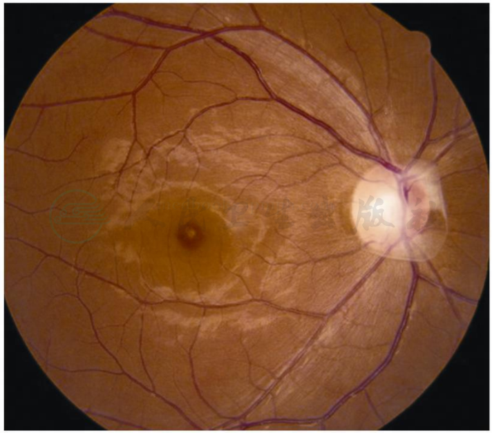 视盘前膜或名视乳头前膜,是位于视盘前的一层透明或半透明膜,像薄的纱巾一样,隐约地遮蔽着视盘;或者有时像蜘蛛网一样覆盖在视盘前面;然而,更多的是在视盘生理凹陷处,视网膜中央动、静脉的两旁,像白色半透明的鞘膜一样,伴随着血管进出(图1)。是由于原始视盘即所谓Bergmeistery原始乳头(Bergmeister's papilla)的神经胶质组织萎缩和吸收不全和/或来自玻璃体动脉的中胚层组织残留的薄膜。这是一种先天变异,不是病理性的产物。