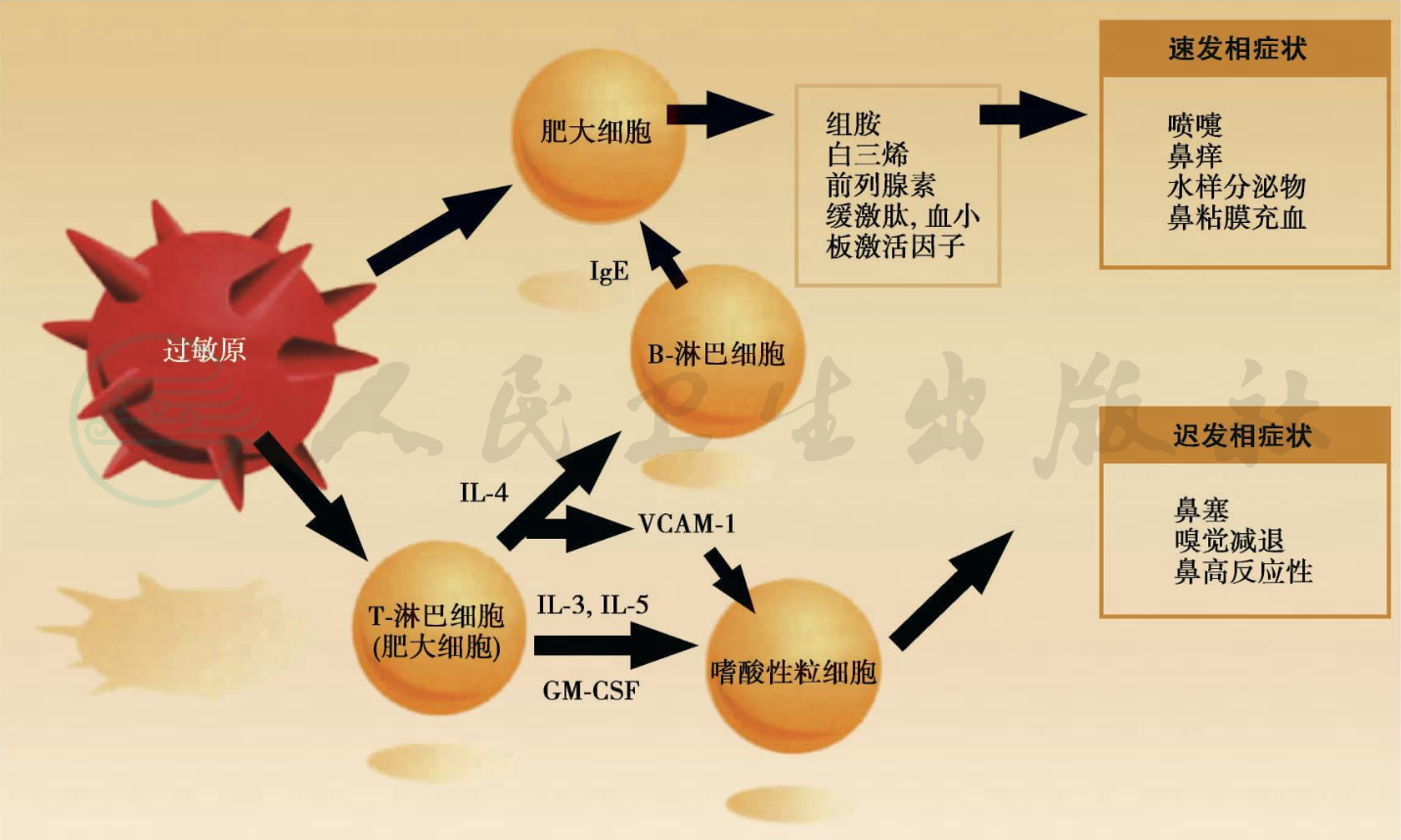 花粉症的慢性化过程表现为过敏性炎症,即局部炎性细胞聚积,主要涉及嗜酸性粒细胞,T淋巴细胞通过释放前炎性细胞因子,促进黏膜嗜酸性粒细胞移行、活化,同时还有黏附分子参与。细胞因子的促炎症作用比组胺、白三烯、前列腺等更稳定、更强、更持久(图1)。