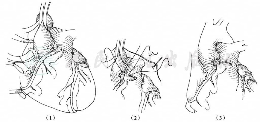 (1)从肺总动脉切下右冠动脉;(2)右冠动脉与主动脉作吻合术,缝合肺总动脉;(3)右冠动脉移植术完成