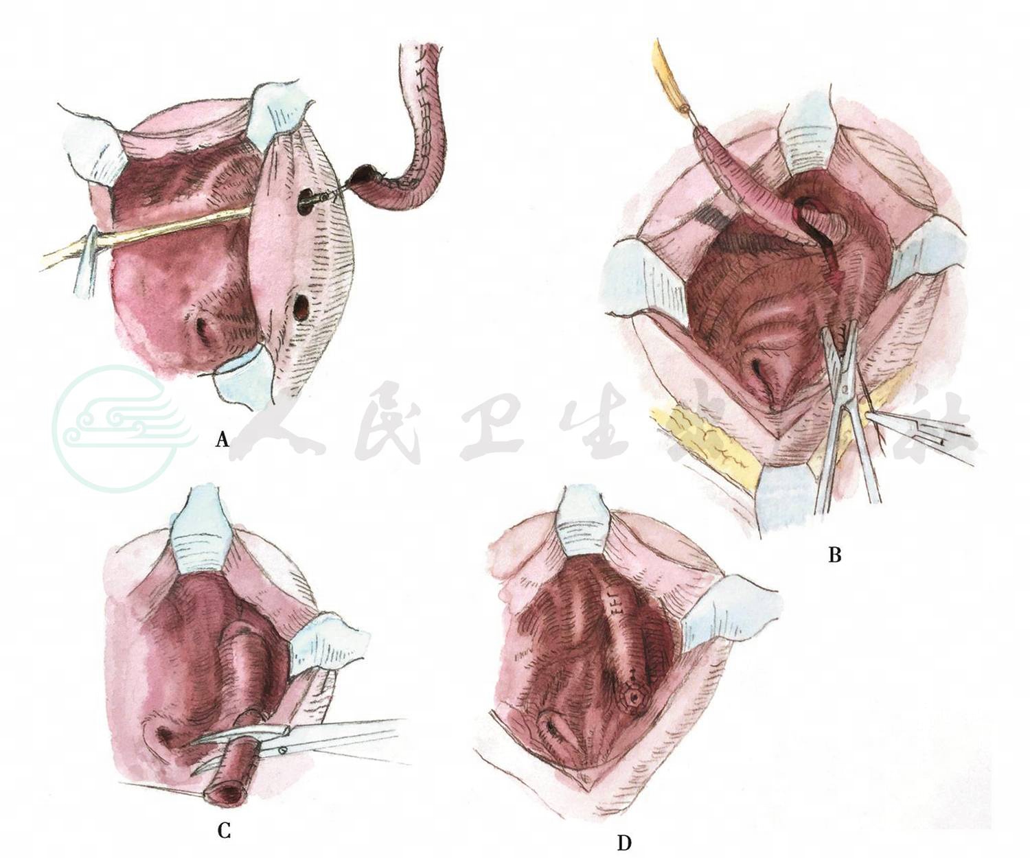 手术方法为切除发育不全的输尿管末端,裁剪缩窄管腔使接近正常口径,松解游离上段输尿管,解除输尿管扭曲,将输尿管包埋于膀胱浆肌层下隧道里,将新的输尿管开口与三角区肌层边缘缝合。